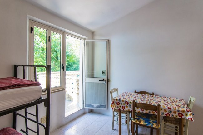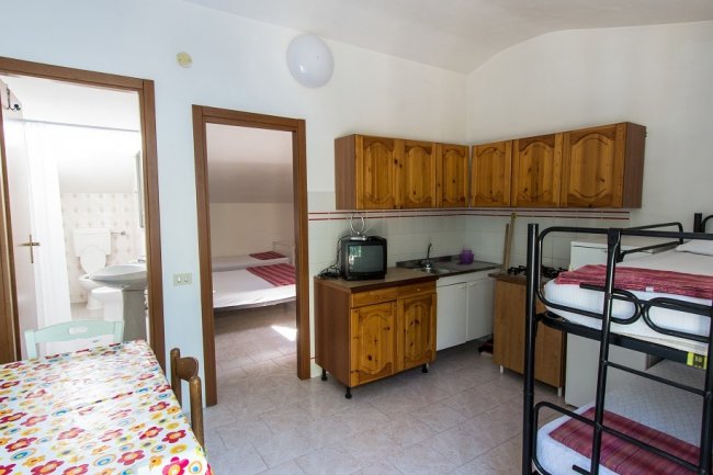 TRILOCALI 4 POSTI PRIMO PIANO: Questi appartamenti tipo residence si trovano al primo piano di una struttura su due livelli e vi si accede da una terrazza condivisa dai due bungalow. All’interno troverete una cucina, una camera matrimoniale, una camera con letto a castello e un bagno con doccia.
