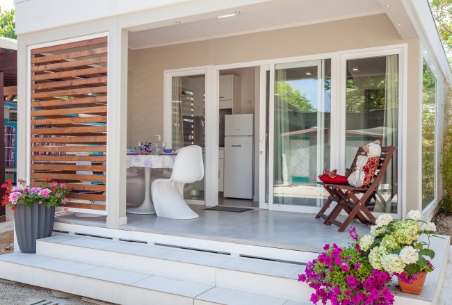 CHALET da 4 a 6 posti (da 38 a 50 mq) Mobile Home con veranda esterna attrezzata, area giorno con angolo cottura, camera matrimoniale, camera con 2 o 3 letti, bagno, TV, aria condizionata. Alcuni Chalet si differenziano in: